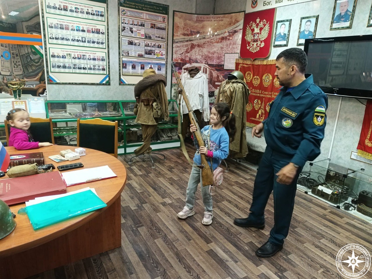 Сначала в Музее по ГОЧС они погрузились в прошлое в 1941-1945 годы и ознакомились с экспозициями, посвященными 80-летию Победы. На манекенах были представлены образы советского солдата и дети могли посмотреть и потрогать амуницию, форму, вооружение, изучить состав сухого пайка. Большой интерес вызвала настоящая винтовка Мосина 1942 года выпуска. Каждый хотел подержать оружие в руках. Еще одна экспозиция была посвящена находкам поисковиков. Эти предметы с полей сражений – память о защитниках Родины, свидетели героического прошлого. Дети спрашивали, что это, где нашли, просили потрогать руками.