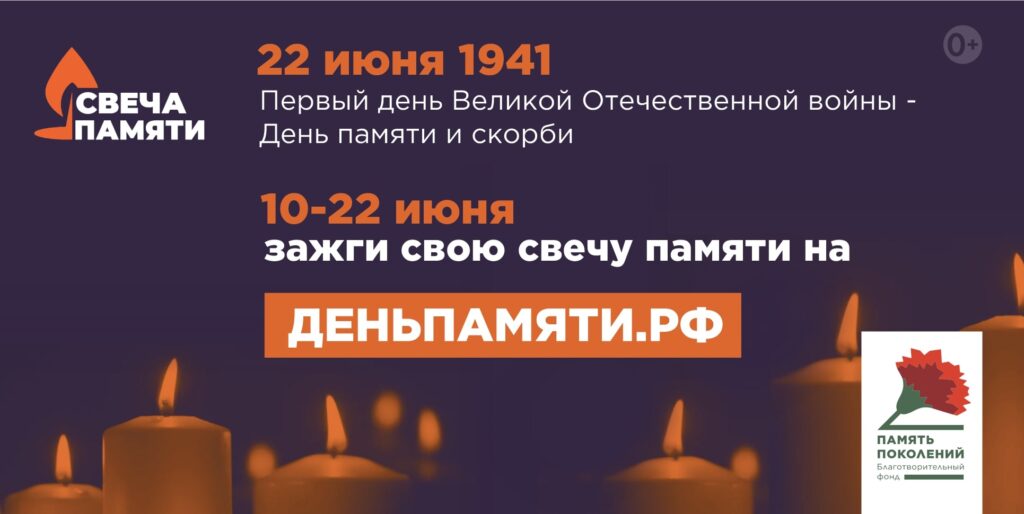22 июня в Российской Федерации отмечается памятная дата – День памяти и скорби – день начала Великой Отечественной войны. В этот день народы России скорбят по своим соотечественникам, которые стали жертвами Великой Отечественной войны 1941–1945 годов и ценой жизни защитили свою Родину. На территории всей страны приспускаются государственные флаги, а в учреждениях культуры, на телевидении и радио в течение всего дня отменяются развлекательные мероприятия и передачи. Одним из ключевых тематических проектов Дня памяти и скорби является Всероссийская онлайн-акция «Свеча памяти» (далее – Акция).